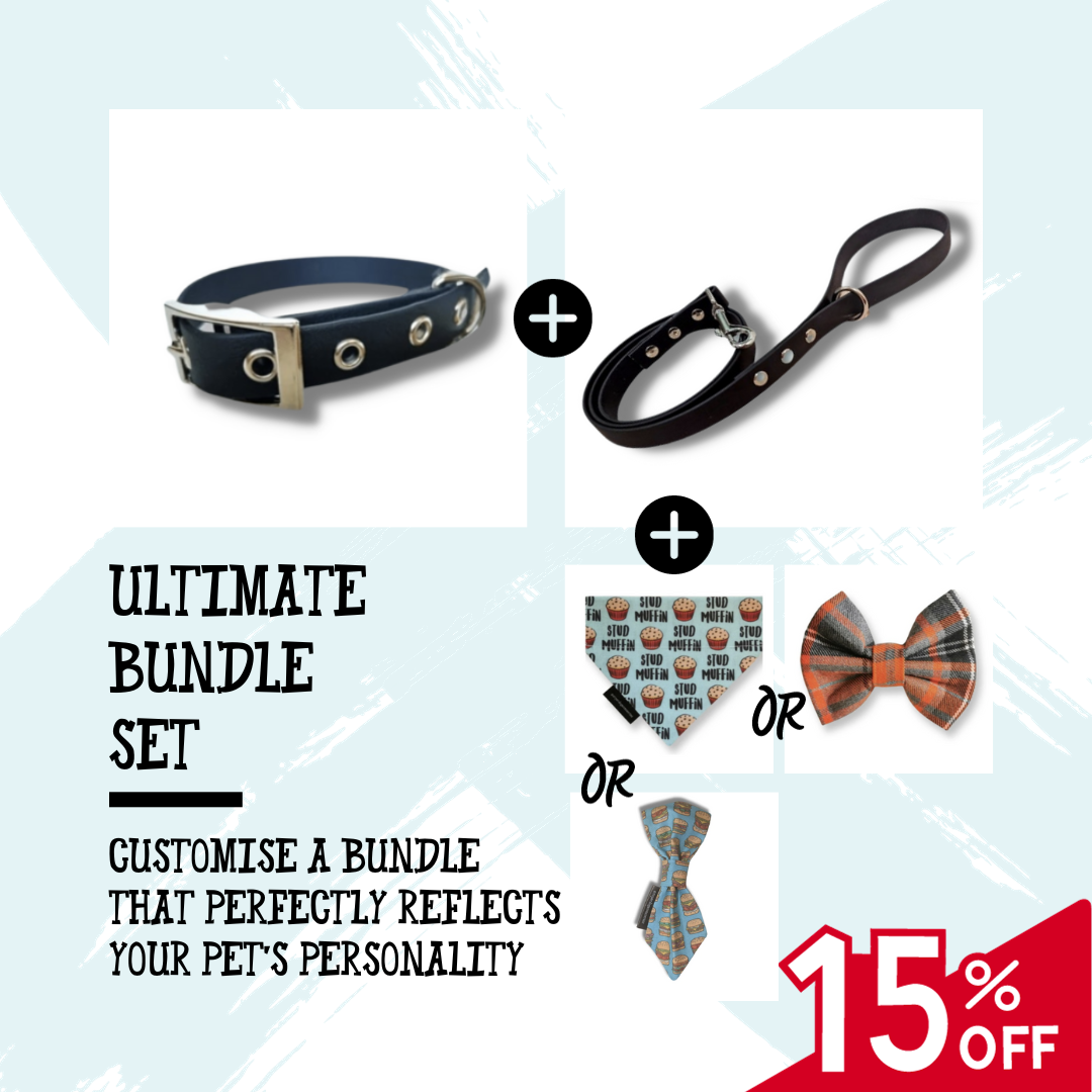 Create your very own style statement for your pup with our Ultimate Bundle Set! Customise your bundle by choosing a collar, lead, and accessory that suits your dog's personality. Whether it's a vibrant bandana, a charming bowtie, or a necktie for a dapper look, this bundle has it all.